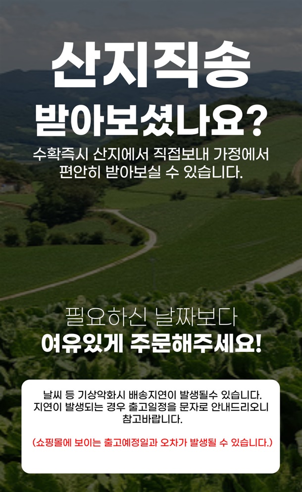· 배송은 입금확인된 날짜로부터 1~3일 소요되며 최대 7일 이내 출고됩니다. ( 공휴일, 기상악화 등 불가피한 상황에 따라 추가 지연될 수 있습니다.)
