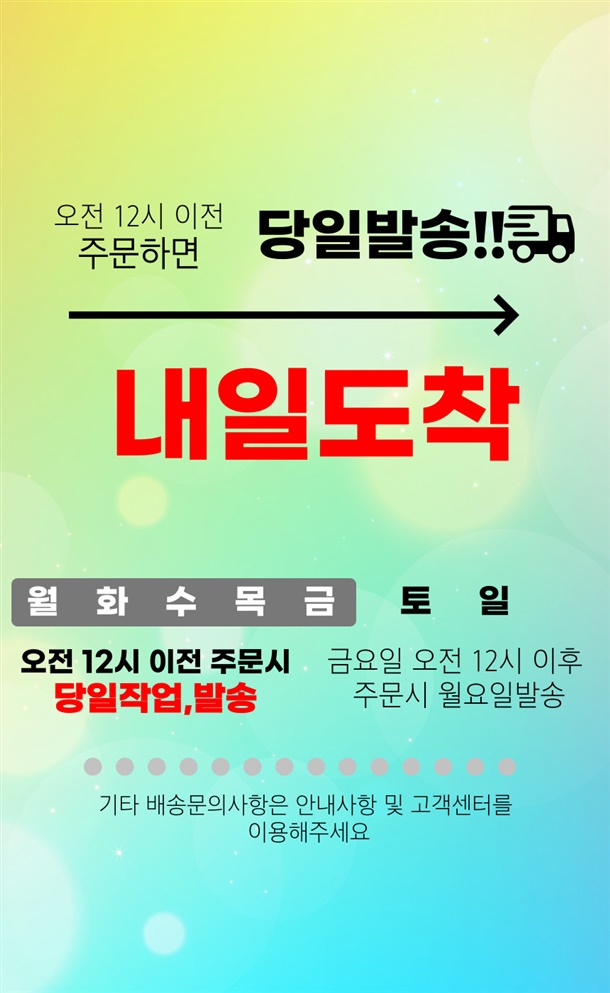 · 배송은 입금확인된 날짜로부터 1~3일 소요되며 최대 7일 이내 출고됩니다. ( 공휴일, 기상악화 등 불가피한 상황에 따라 추가 지연될 수 있습니다.)